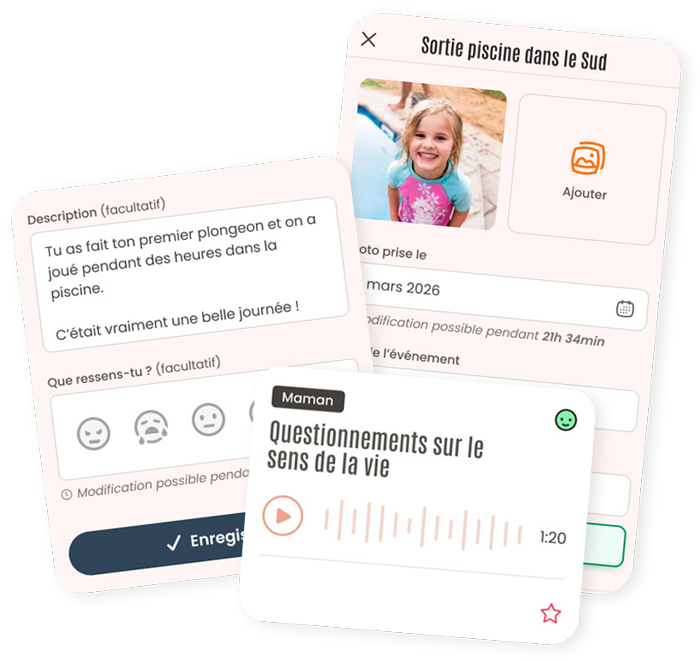 Jour après jour, année après année, vous y consignez les petits et grands moments de sa vie : ses premiers sourires, ses mots maladroits, ses victoires, ses peurs, ses éclats de rire, ses silences aussi. Des souvenirs précieux, conservés en toute sécurité dans un espace personnel et sécurisé.